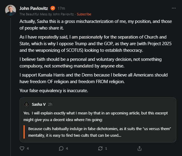 Because cults habitually indulge in false dichotomies, as it suits the “us versus them” mentality, it is easy to find two cults that can be used form a synthetic triad. One cult’s ideology represents the thesis, the other’s the antithesis. These are then combined into the system that the political alchemists actually want. One currently forming in the United States is a progressive Christian theocracy, whose right wing is represented by Ken Ham, and whose left wing is represented by John Pavlovitz, who made the mistake of attempting to gaslight me when I shared this excerpt in a Note two weeks ago: