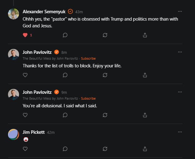 If there is one thing you should take away from anything I’ve ever written about “fundamentalists,” it is that they want to create a theocracy by using the power of the State to tell Christians what to believe, which is why I elected to publish my article on Answers in Genesis first, and Pavlov’s Itch wants to create a theocracy by preaching politics from the pulpit (for which he was de-frocked… twice) so that Christians will vote the way he tells them. Jacob Tothe, the Anarchist Librarian (though who knows how much longer he will hold on to that title), as well as many Christian Substackers, in particular, Alexander Semenyuk…