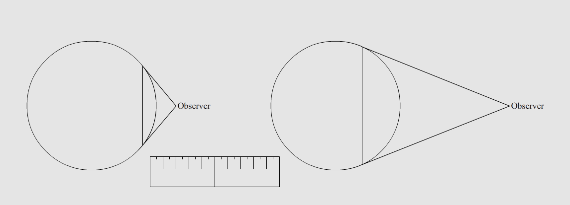 The closer an observer is to a sphere, the less of the surface can be captured in an image. In the illustration on the left, the observer’s distance from the surface is 15% the diameter of the sphere, and the amount of surface that can be seen is 62% the diameter of the sphere. In the illustration on the right, the observer’s distance from the surface is 85% the diameter of the sphere, and the amount of surface that can be seen is 90% the diameter of the sphere. I included a little scale so that you can verify these numbers for yourself. You can easily replicate the effect observed in the NASA photos by getting a desk globe and taking pictures of it at different distances, using a wide-angle lens such that the entire surface is in the shot and the outline is always a circle.